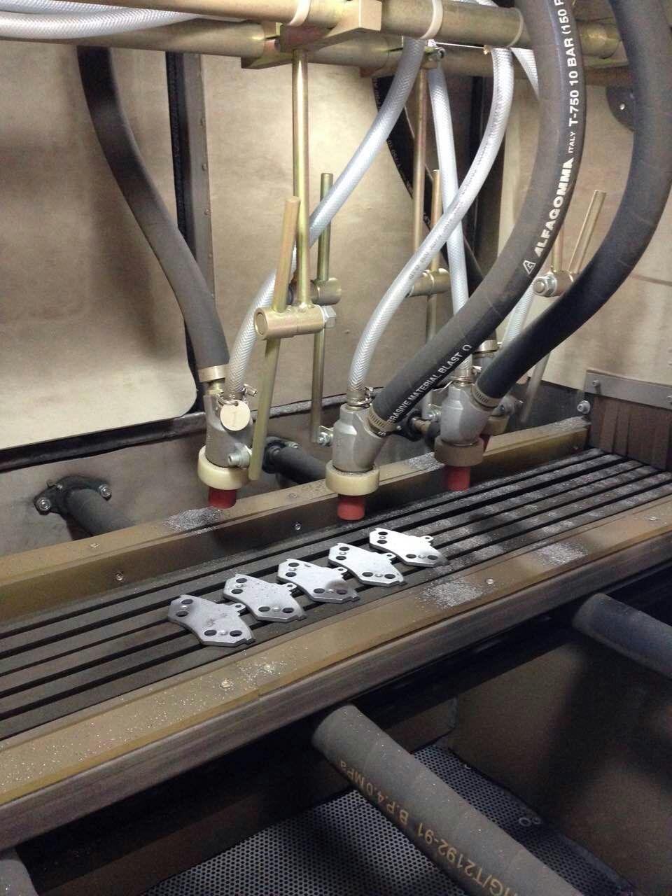 剎車片的生產過程中質量尤為關鍵,其中最重要的一個生產環節,鐵才與剎車片雛形粘合,粘合前需要通過自動噴砂機,才能有效的粘合。